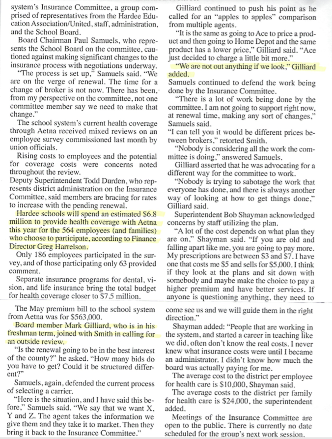 Not long after that the Board put out bids for an Insurance Broker. The broker had to have an office in the County and there were several other limiting conditions leaving only one person to bid. Albritton Insurance. Since then the employees and tax payers are at the mercy of ONE agent. Needless to say they have been paying the price.