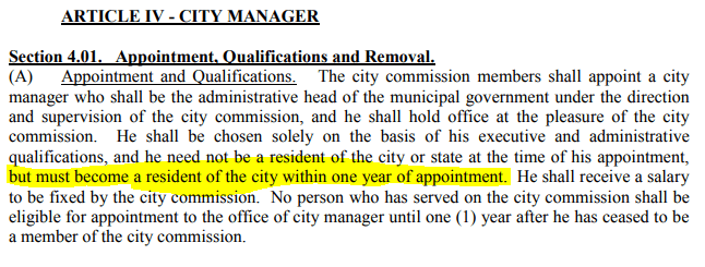 It’s also listed in the City Charter that the City Manager has one year after taking office to become a resident of the City.