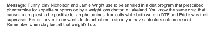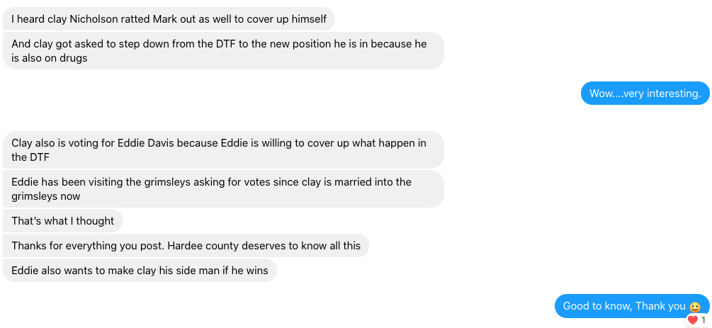 Multiple sources have told me about how some Deputies had/have drug addiction problems and some are still there. They Say Cpt Eddie Davis protects them. Here are a few interesting parts of convos. Most is referring to Deputy Clay Nicholson. Most people here know what goes on but are afraid of retaliation. Me, not so much. After I sent this to the Hardee Sheriff’s Department, one of my sources was arrested by the US Marshal Service. It’s not good when Drug dealers deal and druggies use, but when it’s a Deputy, It’s OK? In the messages below Eddie Davis is the Captain at the Sheriffs Department and Clay is on the Drug Task Force (DTF).
